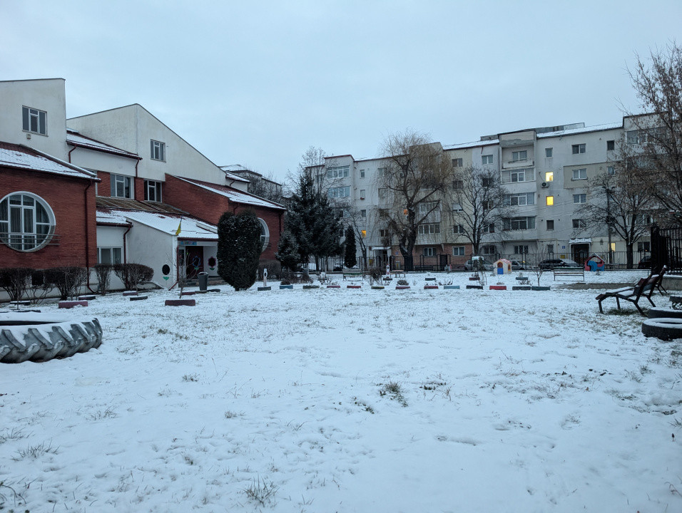 Zonă liniștită cu verdeață in fata blocului, aproape de grădinița Lizuca.